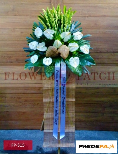 These Funeral Flower Standee, Standing Arrangement of White Anthuriums and Tuberoses (FP-S15) is one of our funeral flower arrangement with free funeral flower delivery. Compose of Standing Arrangement of White Anthuriums and Tuberoses.